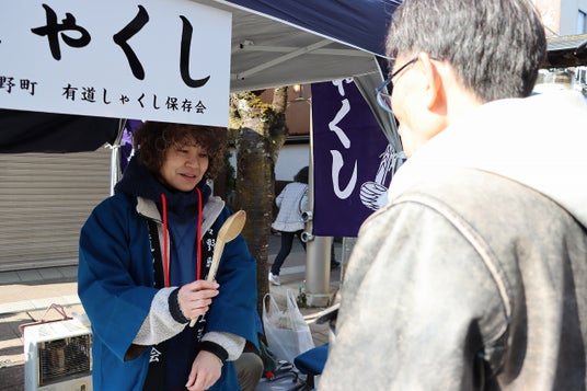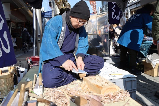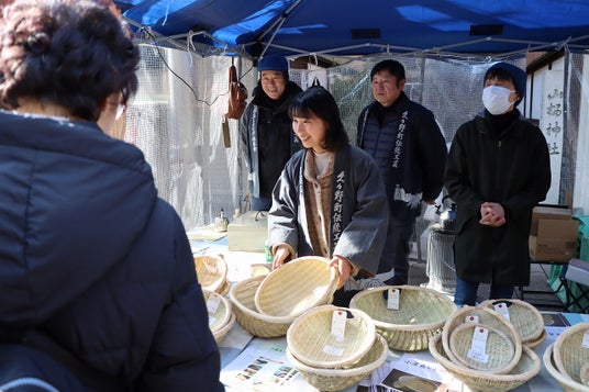 今年も、令和7年1月24日(金)に開催され、本町通り商店街と安川通り商店街の合わせて約900メートルにわたって食品や木工品などを販売する露店66店が並び、竹を編んだ「小屋名しょうけ」と呼ばれるざるや、朴ノ木を削って作る「有道(うとう)しゃくし」、薄く切ったヒノキやイチイを編んで作る「宮笠(みやがさ)」などの昔ながらの民芸品などが販売され、朝から多くの買い物客で賑わいました。