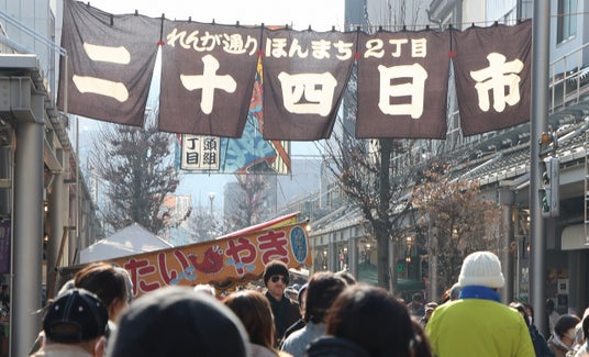 「二十四日市」は、昔から“天候が荒れる”という言い伝えがありますが、雪が例年に比べて少ない今年は、3月中旬並みの気温の中、買い物を楽しむたくさんの地元住民や外国人観光客の姿が見られました。市観光課によると、今年の二十四日市の人出は約45,000人で、昨年の32,000人を大きく上回りました。
