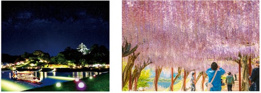 ・公式HP :https://okayama-castle.jp/ ・イベントサイト :https://okayama-castle.jp/spring2025/ 《石山公園ではグルメマーケットも開催!》 岡山城を望む「石山公園」(岡山県岡山市北区石関町7)では、5月3日(土・祝)~5月6日(火・振休)、各日14時から21時までグルメマーケット「ゴールデン夜市」が開催されます。 【藤公園】 岡山県和気町にある藤公園は昭和60年に開園。全国から著名な藤を集めて作られ、その数は約100種、140本に及び種類の多さでは日本一を誇ります。約7,000平方メートル の敷地にある幅約7m、総延長500mの藤棚では白や紫、ピンクの花が咲き誇り、多くの観光客の目を楽しませます。
