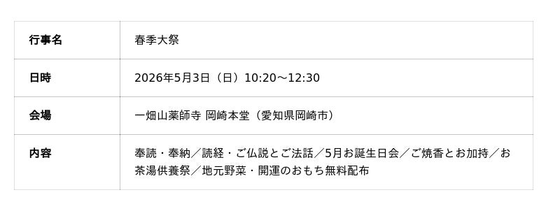 2026年5月3日(日)、岡崎本堂にて「春季大祭」を厳修。参詣者一人ひとりの願いを一つの“大願”として御本尊・薬師如来様へ捧げる、歴史ある祈願祭です。当日は、お参りだけでなく地域に根ざした嬉しい特典も満載!その見どころをご紹介します。