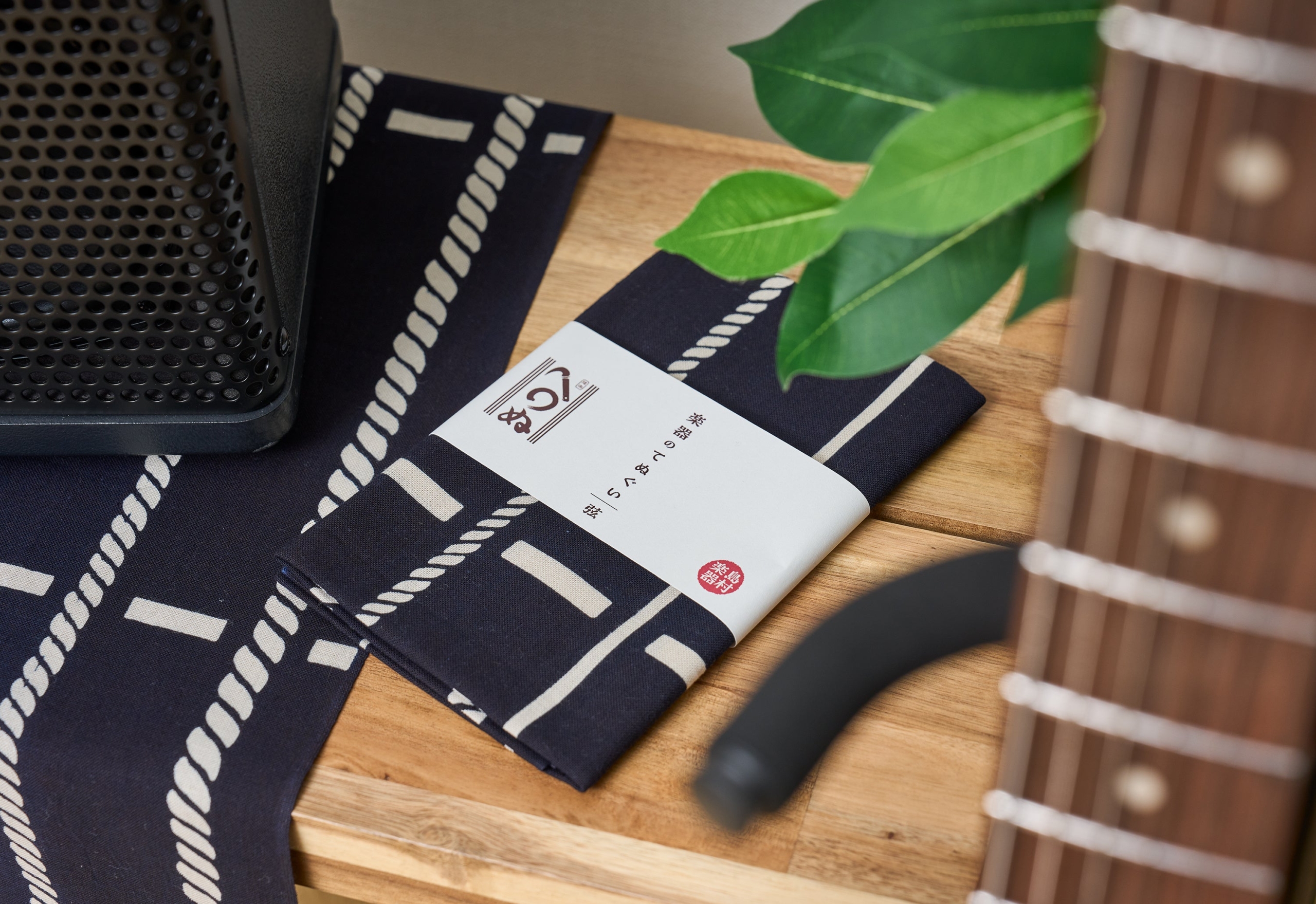 付属のてぬぐいは、ギター弦のイラストが描かれたオリジナルデザイン。汚れが目立ちにくいダークカラーなので、日常使いとして気兼ねなくお使いいただけます。