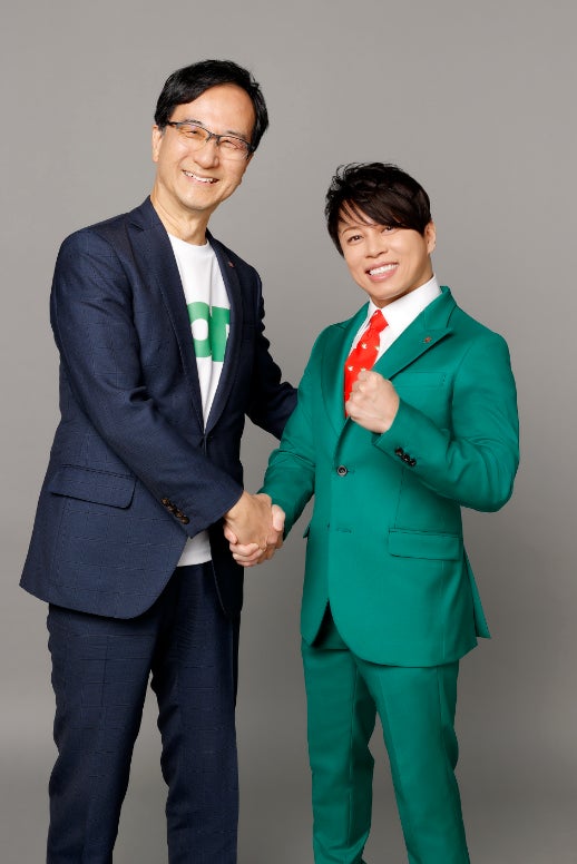 平和堂コーポレートカラーである緑と赤を基調とした「平和堂特命GMスーツ」を着て活動いただく西川貴教さんと平和堂代表取締役社長CEO平松正嗣(左)