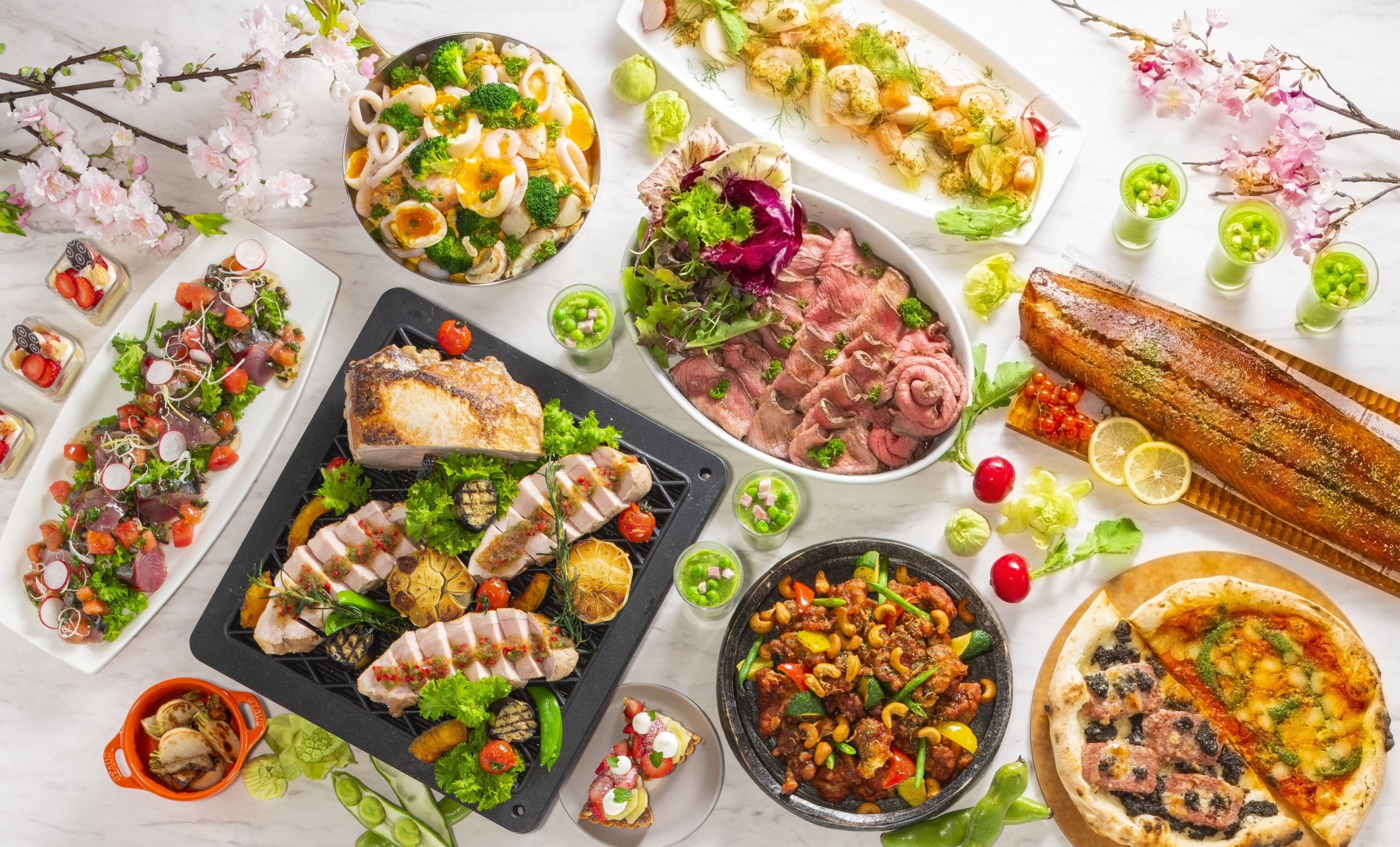 3月:蟹と菜の花の冷製パスタ このほか、冷製・温製メニューともに豊富なラインアップをご用意。前菜からメインまで、幅広いジャンルのお料理がブッフェ台を彩ります。 <メニュー例>