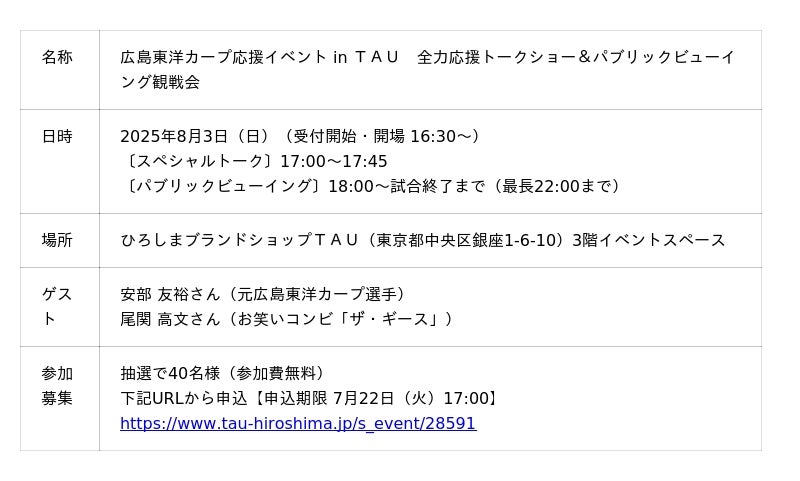 【広島県】広島東洋カープ応援イベント in TAU、全力応援トークショー&パブリックビューイング観戦会!安部友裕と尾関高文がゲストで登場