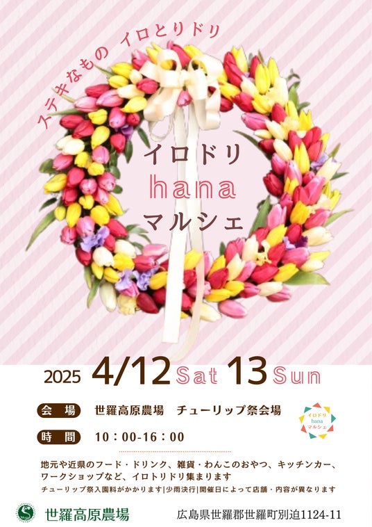 世羅高原農場では、2024年に初開催し好評の「イロドリhanaマルシェ」を2025年も開催します。チューリップが咲き広がる園内に、世羅町や県内、近県のステキなものが大集合します。花と一緒にお買い物をお楽しみください。