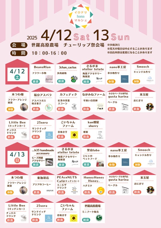 【広島/世羅】地元世羅をはじめ、広島県内、近県から雑貨、飲食、体験メニュー満載!チューリップ畑でお買い物を楽しもう イロドリhanaマルシェ《世羅高原農場》