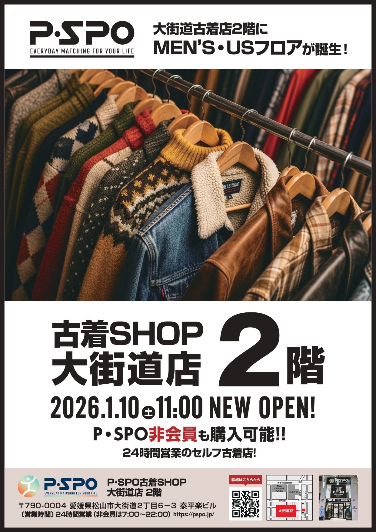 古着SHOP大街道店(所在地:愛媛県松山市)は、2026年1月10日(土)より、2階フロアを新たにオープンします。
