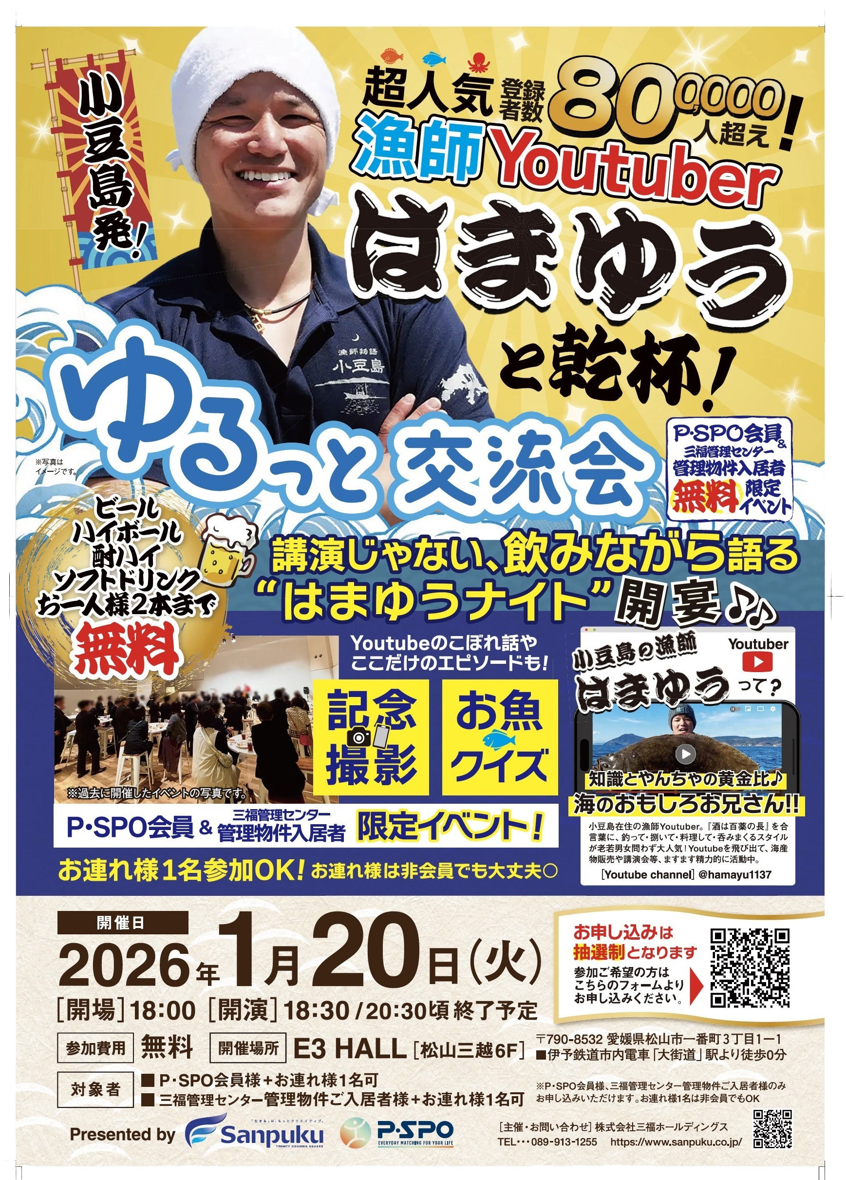 小豆島発の漁師YouTuber はまゆう を招いた交流イベント「はまゆうナイト」を、2026年1月20日(火)に松山三越6階「E3 HALL」で開催します。本イベントは、P・SPO会員様および三福管理センター管理物件ご入居者様を対象とした、参加費無料の事前申込・抽選制イベントです。