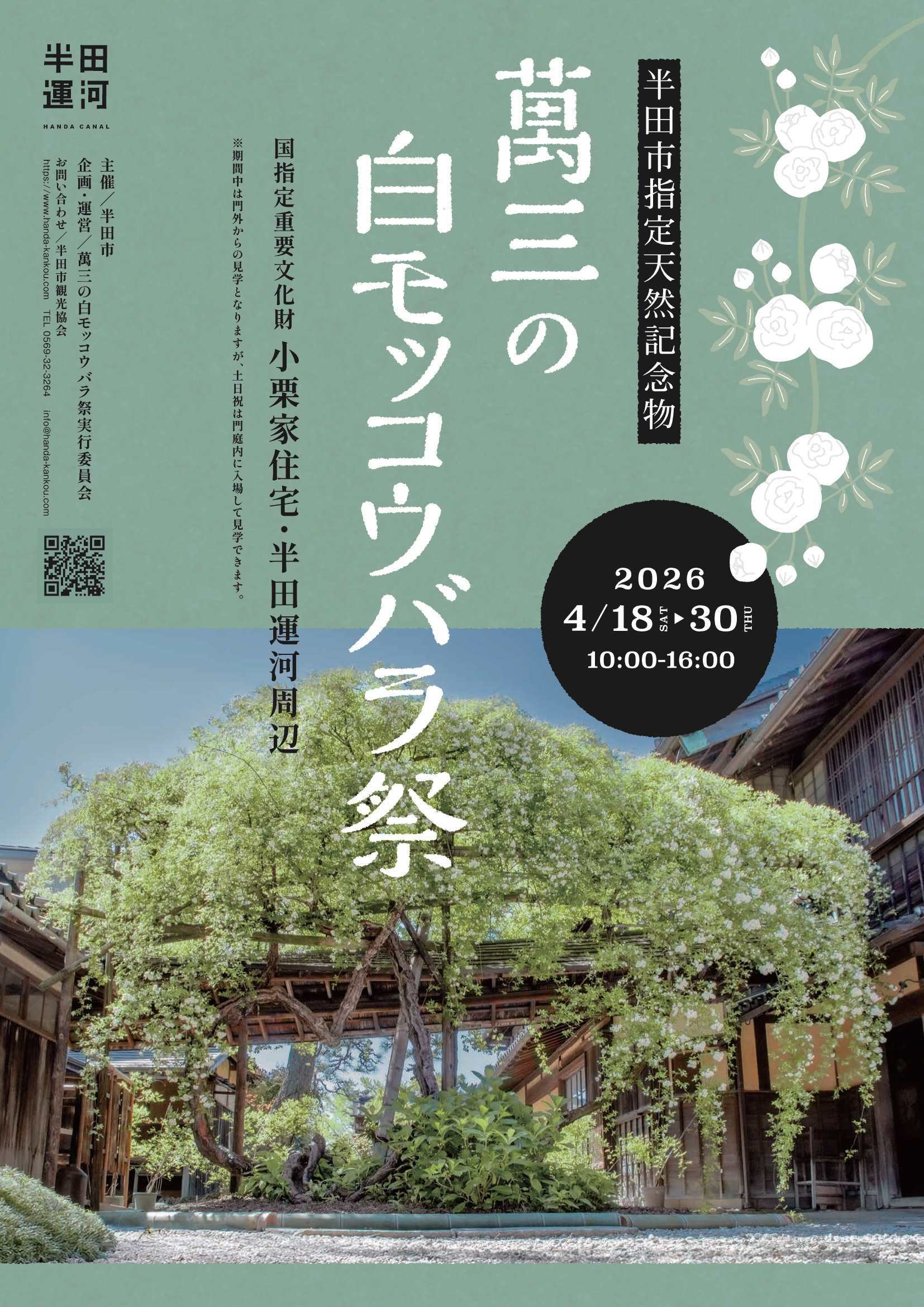 2026年4月18日(土)より、半田市指定天然記念物「萬三の白モッコウバラ」を主役にした『萬三の白モッコウバラ祭』が開催されます。国指定重要文化財「小栗家住宅」の歴史ある佇まいと、160年の時を超えて咲き誇る白モッコウバラが織りなす景観は、まさに圧巻の一言です。