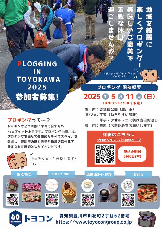 株式会社トヨコン(本社:愛知県豊川市)は、2025年5月11日(日)10時より愛知県豊川市にある「赤塚山公園 わくわくパーク」にて、環境保全と健康促進を目的とした「プロギングin TOYOKAWA 2025」を開催いたします。