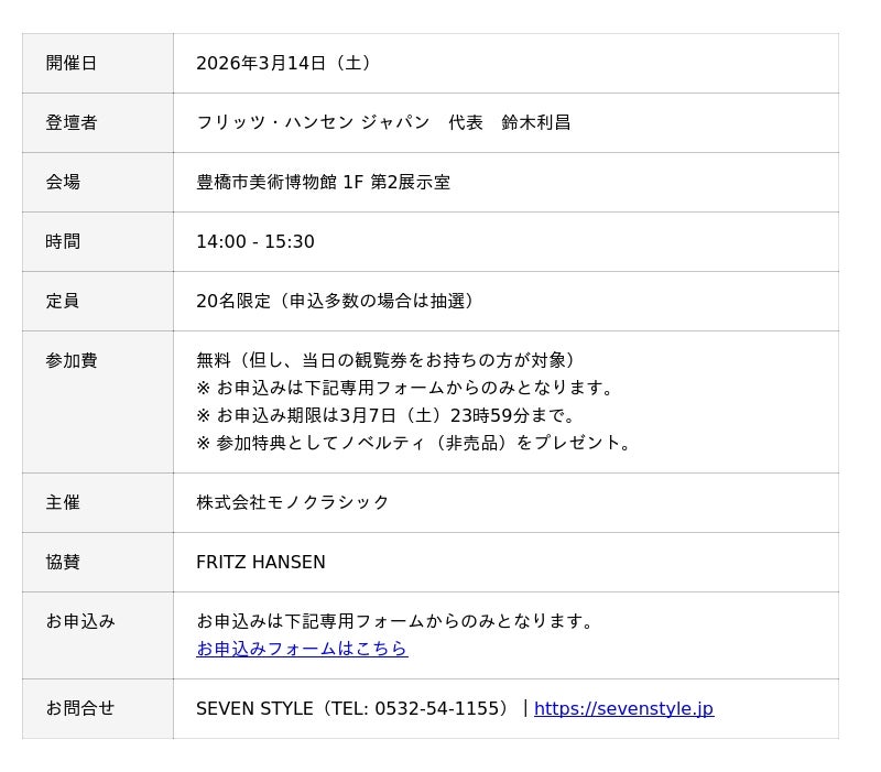 豊橋市美術博物館で開催する展覧会を記念して、フリッツ・ハンセン ジャパンの鈴木代表をお招きして、ポール・ケアホルムの魅力に迫るトークイベントを開催いたします。実際に展示してあるケアホルム作品を解説しながら、展示室の中を周るガイドツアーもおこないます。
