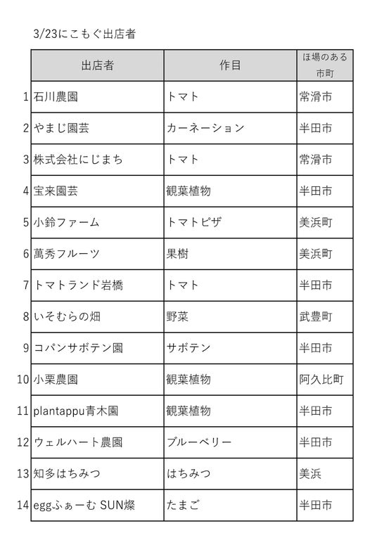 【愛知県半田市】3/23(日)知多半島農業マルシェ「にこもぐ」を開催します!〈半田市役所 ごん吉くん広場〉