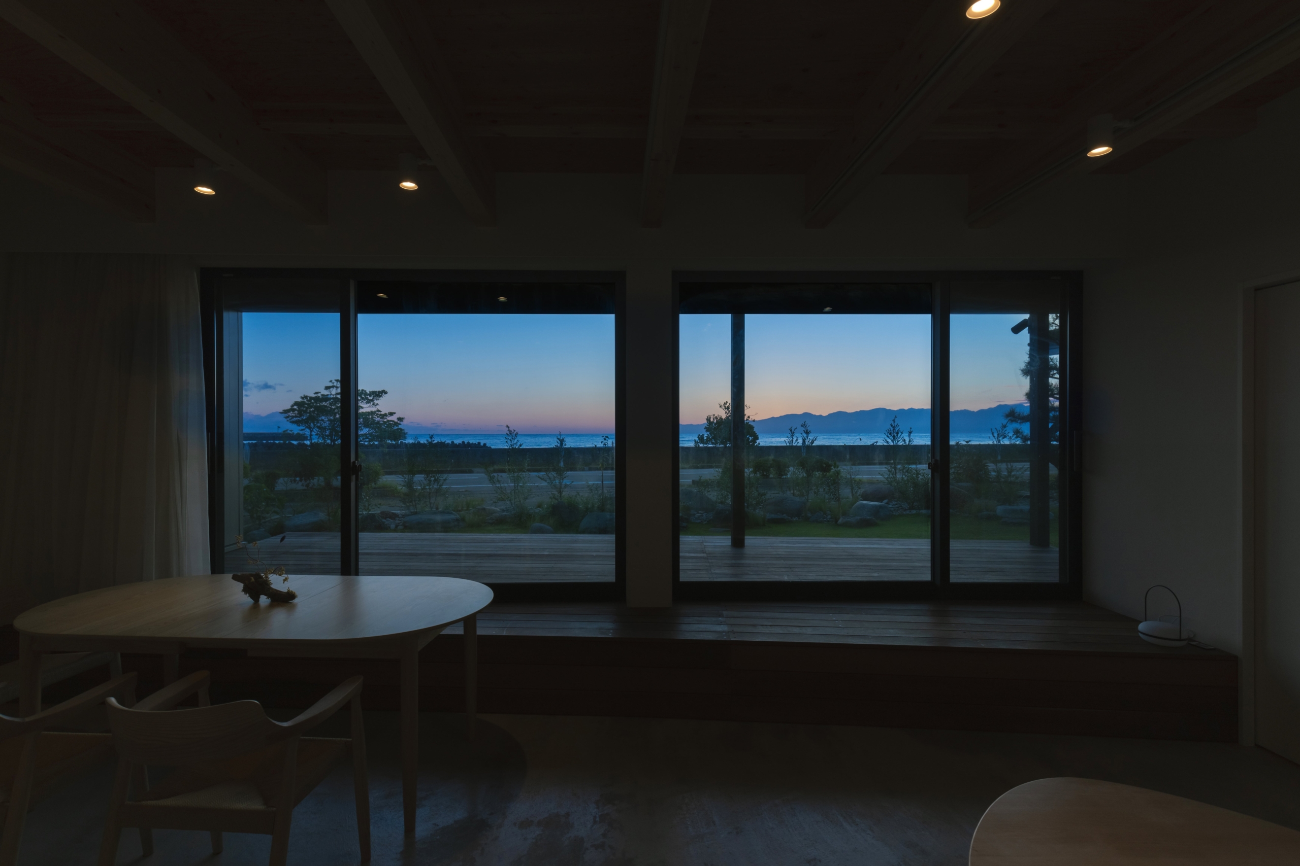 「氷見のうみと」は、氷見駅から徒歩7分の海沿いに位置。目の前に広がる富山湾越しに立山連峰を眺めることができる贅沢な立地です。建物がまちや人に対して“ひらけていること“をコンセプトに、滞在する人が風通しの良さを感じられる空間を目指して設計しました。最大の特徴は、リビング・ダイニングに沿って設けた大きく開放的な窓です。窓を貫くようにリビングから庭へと続くデッキが中と外の境目を曖昧にし、屋内にいながらも外にいるような感覚で、富山湾と立山連峰を望むことができます。外壁には反射によって表情が変わる素材を採用し、早朝の淡いピンク色の空や、雨に濡れた松の木の緑など、氷見のやわらかな光の機微を映し出します。また、城端の松井機業に制作を依頼したしけ絹のカーテンなど、地域の伝統的な素材も空間に取り入れています。