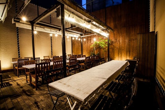 客席を24席ご用意するこのガーデンテラスは、屋根つきなので、梅雨が明けないこの時期でも天候を気にせず、安心してご利用いただけます。「さかえや 高田馬場總本店」店舗情報