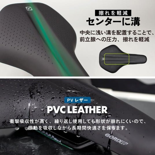 中央の溝が前立腺への負担を軽減。耐久性の高いPVCレザートップは、耐水性・耐摩耗性に優れ、