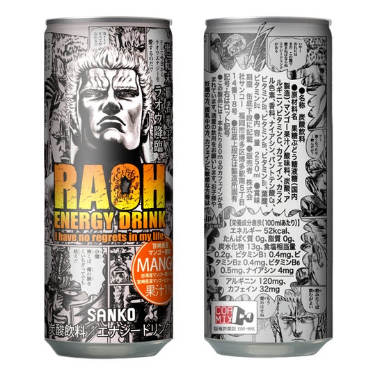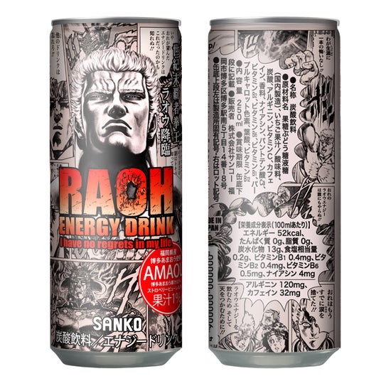 福岡県の飲料メーカー、株式会社サンコー(本社・福岡市博多区)より、エナジードリンク「ラオウエナジー」が発売となりました。創刊40周年を迎えた伝説のバトルアクション漫画「北斗の拳((C)武論尊・原哲夫/コアミックス1983)」の重要キャラクター、ラオウを全面にフィーチャーし、背面には、「わが生涯に一片の悔いなし!!」で有名なラオウの名シーンの数々が、ラオウエナジー風にセリフをアレンジしてデザイン。エナジードリンクを飲みながら、漫画を読んでいる楽しさを味わうことができます。九州の飲料メーカーということで、フレーバーは「博多あまおう風味」と「宮崎県産マンゴー風味」の2種類。10月末より、九州のスーパー、ドラッグストア、(株)サンコーの自動販売機、自社ECショップにて販売スタートしており、今後、全国に向けて展開していく予定。