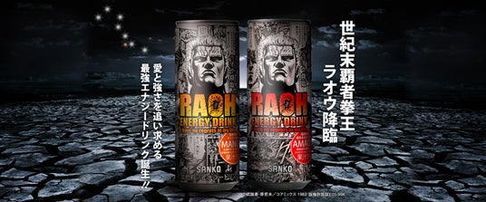 福岡の飲料メーカー、(株)サンコーが「北斗の拳」とコラボしたエナジードリンク「ラオウエナジー」を10月末に発売。「博多あまおう味」「宮崎マンゴー味」の2フレーバー。最強のエナジードリンクの誕生です!!