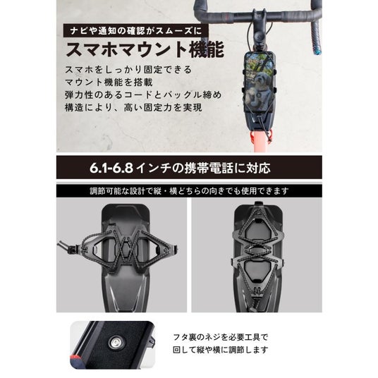 トップチューブバッグにはスマホをしっかり固定できるマウント機能を搭載しています。