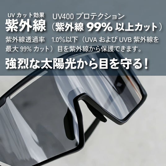 強い日差しでも自然な色合いの視界を保つことで、長時間の着用でも目が疲れにくい設計です。 ワンレンズ構造による広い視界と、UVA・UVBを99%以上カットするUV400プロテクションが