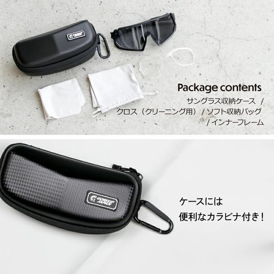 インナーフレーム付きで度付きレンズにも対応しており、視力補正が必要な方にもぴったりです。 収納ケース、クリーニングクロス、ソフト収納バッグなど付属品も豊富で、