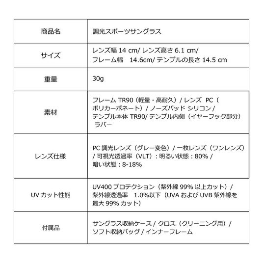 ● 収納ケース・クロス・ソフトバッグなど付属品充実 商品の特徴 【調光レンズ搭載】 紫外線の強さに応じてレンズがグレーに変化し、眩しさを自動で軽減する、