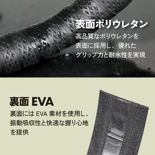 裏面にはEVA素材を使用し、振動吸収性と快適な握り心地を提供します。
