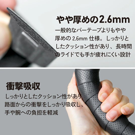 ちょっと厚めの2.6mm設計で快適な握り心地 一般的なバーテープよりもやや厚めの2.6mm仕様です。しっかりとしたクッション性があり、長時間のライドでも手が疲れにくい設計です。