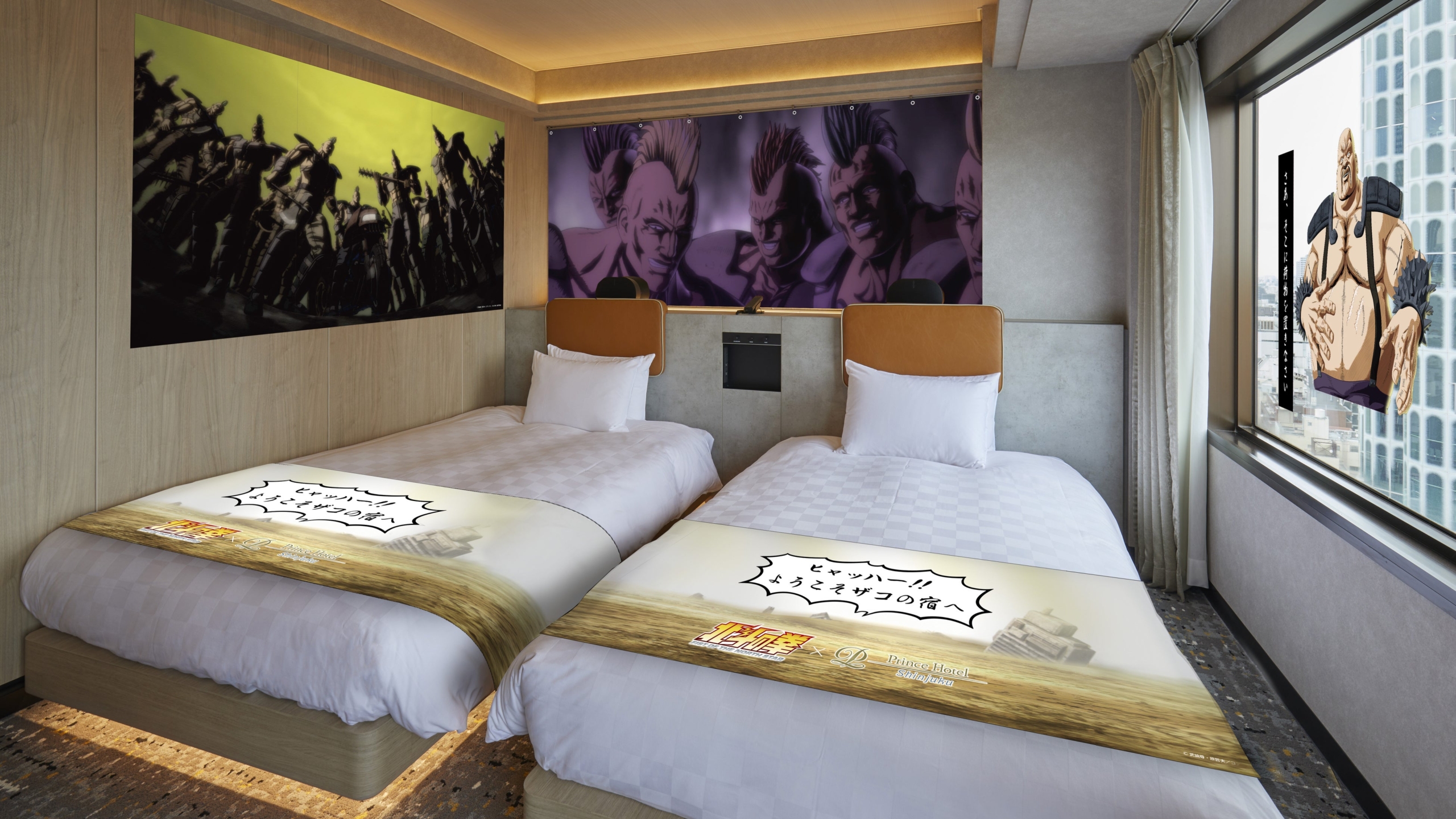 ●北斗の拳ファンのための限定ステイ 【期間】2026 年6 月1 日(月)~7 月31 日(金) 【部屋タイプ】 スーペリアルーム(イマーシブルーム) 【料金】¥29,300 より(イマーシブルーム2 名利用時の1 名料金) 【内容】室料、ノベルティ、特典付き 【予約開始日】2026 年3 月30 日(月)12:00NOON より 【URL】https://www.princehotels.co.jp/shinjuku/plan/fist-of-northstar_collaboration/ 世紀末世界で生きる“ザコたち”の憩いの場をテーマにデザインした、コラボレーション限定の特別ルーム。壁面にはザコキャラクターたちが描かれたタペストリーを配置し、ベッド上・ベッド横にも世界観を表現。照明を落とすと壁に散りばめられた「北斗七星」が浮かび上がり、まるで作中の世界に迷い込んだかのような没入体験をお楽しみいただけます。客室には75 インチの大型テレビとサラウンドスピーカーを備え、アニメ放送(世界配信・地上波)も迫力のある環境で視聴可能。ザコたちの視点になりきって過ごす時間そのものが、ファンにとって忘れられない体験に。