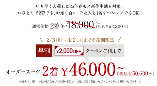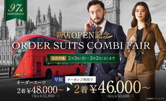 【新店OPEN記念】「グローバルスタイル」は新店OPENを記念し、オーダースーツが2着¥46,000~(税込¥50,600~)のお得なフェアを2月3日~3月2日まで全店舗で開催!