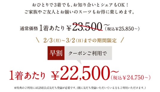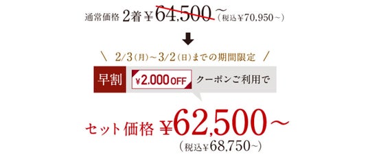 オーダースーツ専門店「グローバルスタイル」を運営するグローバルスタイル株式会社(東京証券取引所 スタンダード市場:7126、本社:大阪市中央区、代表取締役社長 田城弘志)は、2月3日 (月)から3月2日(日)までの期間中、対象プランご利用で、オーダースーツが2着¥46,000~(税込¥50,600~)になるフェアを全39店舗で開催いたします。