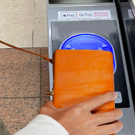 クラッチスタイル等で本体を横に向けてもスマートフォンが抜け落ちにくい、ストッパー付。外側にポケットを装備しているので、モバイルICなら、スマートフォンを出すことなく、自動改札でかざすだけ。