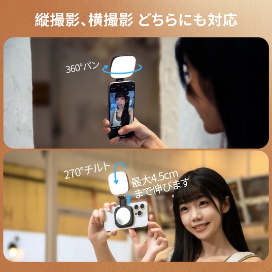 360°のパン機能と270°のチルト機能を備えており、縦撮影や横撮影にも柔軟に対応できます。最大4.5cmまで伸縮可能です。