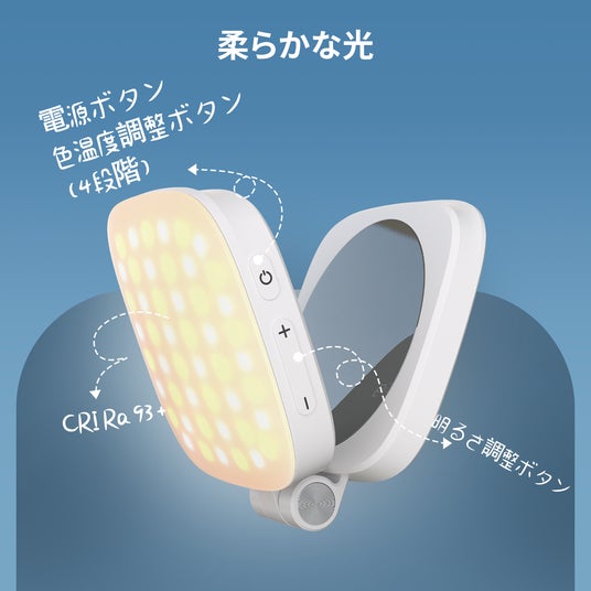 側面のボタンで、5段階の明るさ(20%、40%、60%、80%、100%)と、4段階の色温度(2700K、3200K、4300K、5600K)を簡単に調整できます。コンパクトで収納も容易、操作性にも優れています。