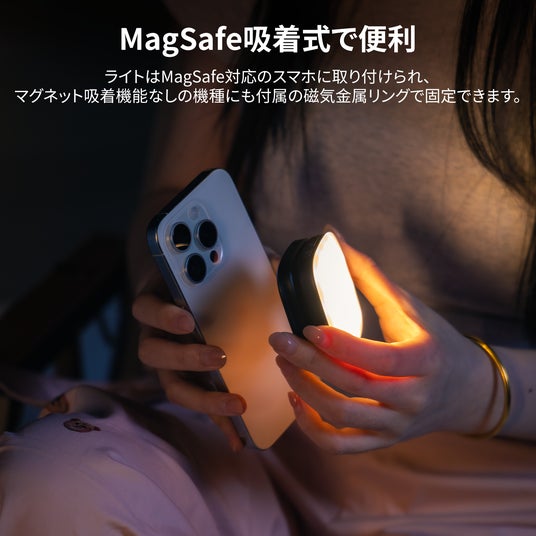 P48は、SmallRig初のMagSafe対応スマホ用LEDビデオライトです。ブラックとピンクの2色からお選びいただけます。MagSafe吸着式で、取り付けが簡単に行えます。MagSafe対応のスマートフォンに直接取り付けられるほか、マグネット吸着機能がない機種にも、付属の磁気金属リングを使って固定できます。