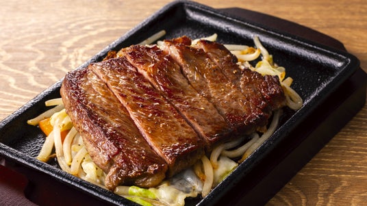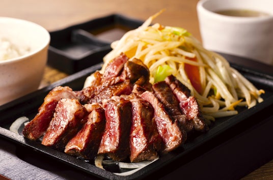 ミディアムレアで提供される熟成ビフテキ定食。鉄板の余熱でお好みの焼き加減に。Mサイズのお肉は180gです。