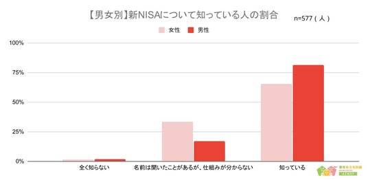 また、男女別に「新NISAについて知っている人の割合」を分析したところ、「全く知らない」は男性の方がわずかに多かったものの、「知っている」という人は男性の方が多い結果になりました。女性では「名前は聞いたことがあるが、仕組みが分からない」を選んだ人が男性を大幅に上回っており、知っていても名前だけという人が比較的多いことがわかりました。