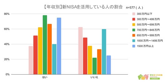 また、実際に新NISAを活用している人は、全体の半数弱という結果になりました。一方、年収別に見てみると700~849万円の人が新NISAを最も活用しているという結果に。約8割の人が新NISAを活用しています。