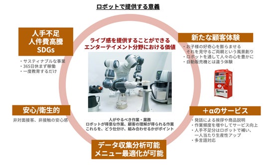 カフェメニューをあえてロボットが作る意義としては、新たな顧客体験を創出することができるということがあります。自動販売機と違って人々の心を豊かにするという側面も持っております。