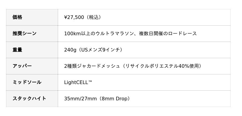 100km以上のウルトラマラソンやステージレースに対応するフラッグシップモデル。LightCELL(TM)超臨界発泡フォームと、生体力学に基づいたミッドソール形状が流れるようなスムーズな足運びをガイド。また、2つのZeroSag(TM)が、超長距離においてもクッション性をキープします。TUNEDFIT(TM) デュアル・レーシングシステムがレース後半の足のむくみにも柔軟に対応し、限界への挑戦を後押しします。