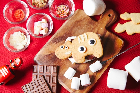 おなかが空いたら、広場の中心にある「赤べこ囲炉裏」を使ったおやつ作り体験がおすすめです。赤べこのクッキーで焼きたてのマシュマロを挟んで作る「赤べこスモア」は、味だけじゃなく見た目も楽しめるべこジェニックな一品です。