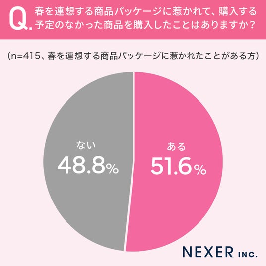 また、買い物時に購入する予定がなくても、春らしいパッケージに惹かれて商品を購入したことがある人は、51.6%と半数以上を占めています。