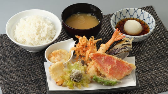 海老2本/海苔/かぼちゃ/大葉/茄子/いか/温泉玉子/ししとう/きす/豚肉