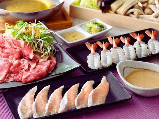 そして、「海鮮しゃぶしゃぶ特別コース」では、トロける脂の味わいがたまらない『生トロサーモン』と、弾力ある食感、おおぶりで上品な甘みとプリプリ食感が特長の『生海老』。