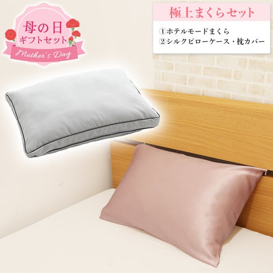 【母の日ギフト】極上まくらセット (ホテルモードまくら+シルクピロケース・枕カバー)当店人気のホテルモードまくらに、SNS等で話題になったシルク素材の枕カバーがセットになった母の日限定セットです。