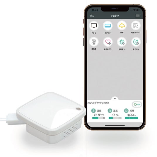 赤外線対応家電を音声操作できるほか、外出先からの操作にも対応。アプリには温度・湿度・明暗が表示されるため、家族やペットの見守りなどにも活用することができます。