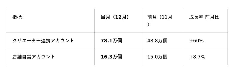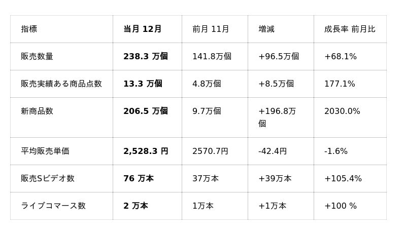 12月も11月に引き続き、前月比成長率が60%を超える高水準の成長を維持しています。その背景として、11月に続く新商品数の増加や、12月に実施されたプラットフォーム主導の年末向けセールなどの販売施策が成長を押し上げたことが挙げられます。加えて、12月は販売ショートビデオの投稿本数およびライブコマースの実施本数が前月比でいずれも100%以上増加しており、これらの施策が全体の販売量拡大に大きく寄与したと考えられます。