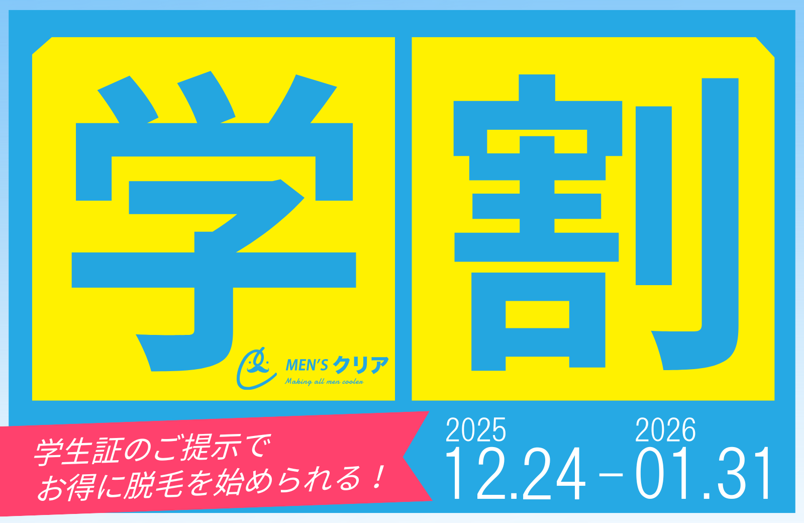 メンズ脱毛サロン「メンズクリア」を運営する株式会社クリア(本社:東京都渋谷区、代表取締役社長:勝沼 潤)は、冬休みを迎える学生の皆様に向け、通常よりもお得に脱毛を始められる「冬の学割キャンペーン」を実施いたします。期間は2025年12月24日(水)から2026年1月31日(土)までです。『ヒゲ脱毛』や『全身脱毛』をお得にご体験いただけます。予約は24時間受付中ですので、春からの新学期や就職活動に向けた「清潔感アップ」したい方はぜひこの機会にご利用ください。