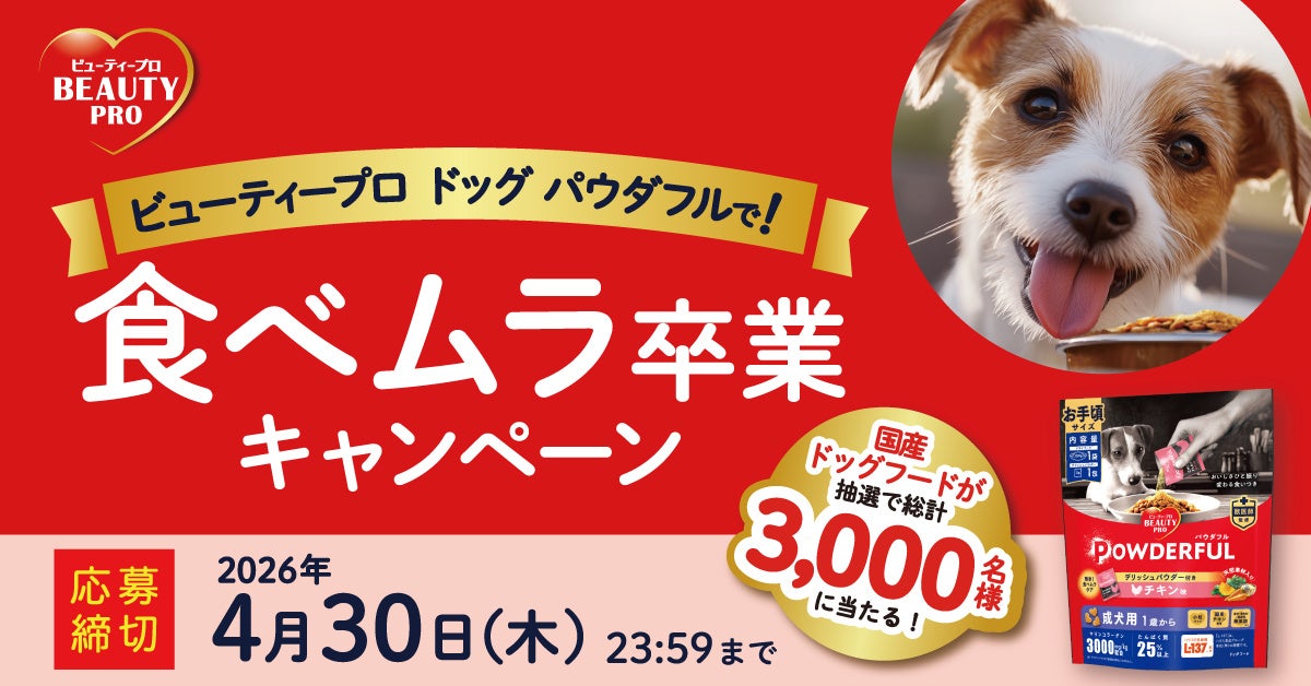 2026年4月1日~4月30日、日本ペットフード株式会社(本社:東京都品川区、代表:代表取締役社長執行役員 片山 俊次)は、「ビューティープロ ドッグ パウダフルで!食べムラ卒業キャンペーン」を実施いたします。