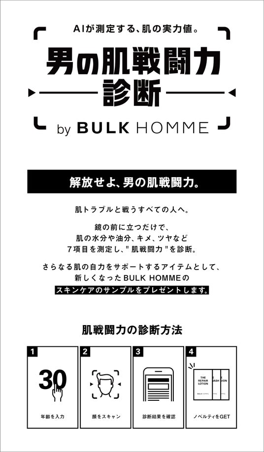 近年、自分の“個性”を客観的に把握する「診断系コンテンツ」への関心が高まっています。骨格診断やパーソナルカラー診断は有料にも関わらず予約が満員になることも珍しくありません。こうした診断は、オンラインでの購買行動が一般化した今、自分に合う商品やサービスを見極めるヒントとして、時間やお金のロスを抑え、迷いや不安を減らすナビゲーションとしても機能しています。一方で、パーソナルカラー、骨格、肌タイプなど、自分が生まれ持ったものを知ることへのニーズは拡大しているものの、男性向けの診断体験は依然として数が少なく、気軽に受けられる場所が少ないのが現状です。 また、紫外線量の増加や温暖化の進行、多様性を尊重する価値観の広がりによる新たな選択肢など、男性を取り巻く環境とスキンケア意識も大きく変化しています。男性がスキンケアをすること自体がまだ一般的ではなかった時代から、「スキンケアは身だしなみの一部であり、日々当たり前に行う自己メンテナンスの1つである」という意識が広がって来ている昨今において、スキンケアはもはや“特別な行為”ではなく、“日常の習慣”として定着しつつあります。 こうした背景を踏まえ、メンズ向けの肌診断には十分なニーズが存在しながらも、体験できる場所が限られている男性向け診断系コンテンツに着目。2025年6月1日(日) から6月5日(木)までの期間、JR大阪駅 アトリウム広場にて、AIで“肌の戦闘力”を可視化するゲーム感覚の新体験型プロモーション『男の肌戦闘力診断』を開催します。メンズスキンケアブランドの先駆けとして、男性の肌を見つめ続けてきたバルクオムだからこそ、男性が潜在的に抱えるニーズに応えつつ、気軽に試せる体験を通じて、自分の肌に向き合うきっかけを提供します。