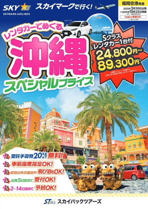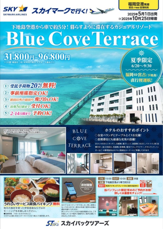 対象ホテル:宮古島全エリアホテル 《たす旅》 https://www.skypaktours.co.jp/st/ja/skymarkdp?promo=prt 【ダイナミックパッケージ『たす旅』とは】 『たす旅』は、スカイマークの航空券と宿泊施設を自由に組み合わせ、WEB上で予約できるダイナミックパッケージです。お客様の旅のスタイルや目的に合わせて、柔軟に旅行プランをつくることができ、スカイパックツアーズならではの旅を提供いたします。